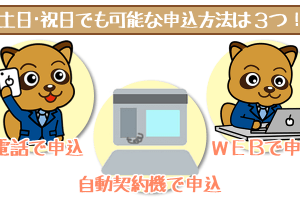 店頭窓口以外なら土日・祝日でも受付可能! 土日・祝日に申し込むことができないのは店頭窓口だけです。 次の3つの…
